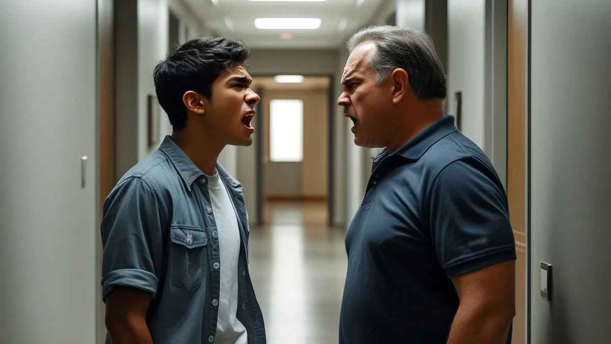 Duas pessoas discutindo em um corredor de condomínio, ilustrando conflito entre vizinhos e a necessidade de ajuda jurídica.