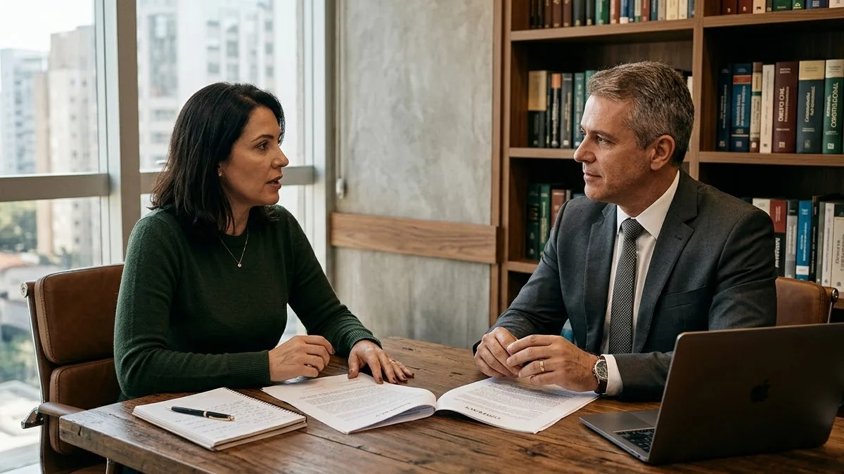 Advogado e cliente em reunião séria discutindo documentos contratuais de plano de saúde em escritório moderno.