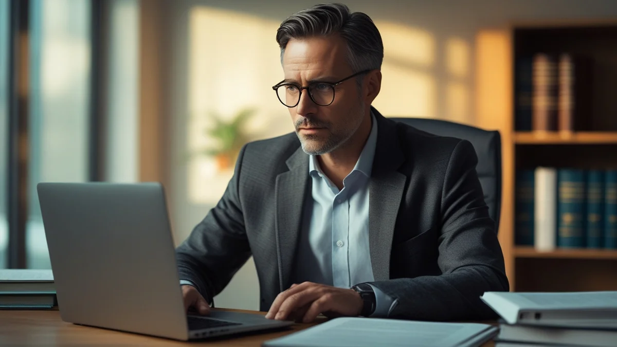 Advogado em São Paulo analisando provas de golpe em transação digital no notebook para cliente.