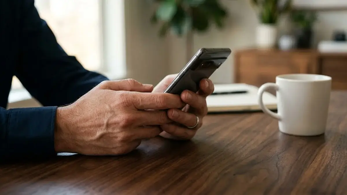 Mãos segurando um celular sobre uma mesa de madeira em um ambiente de escritório, sugerindo a análise de provas de um golpe digital.