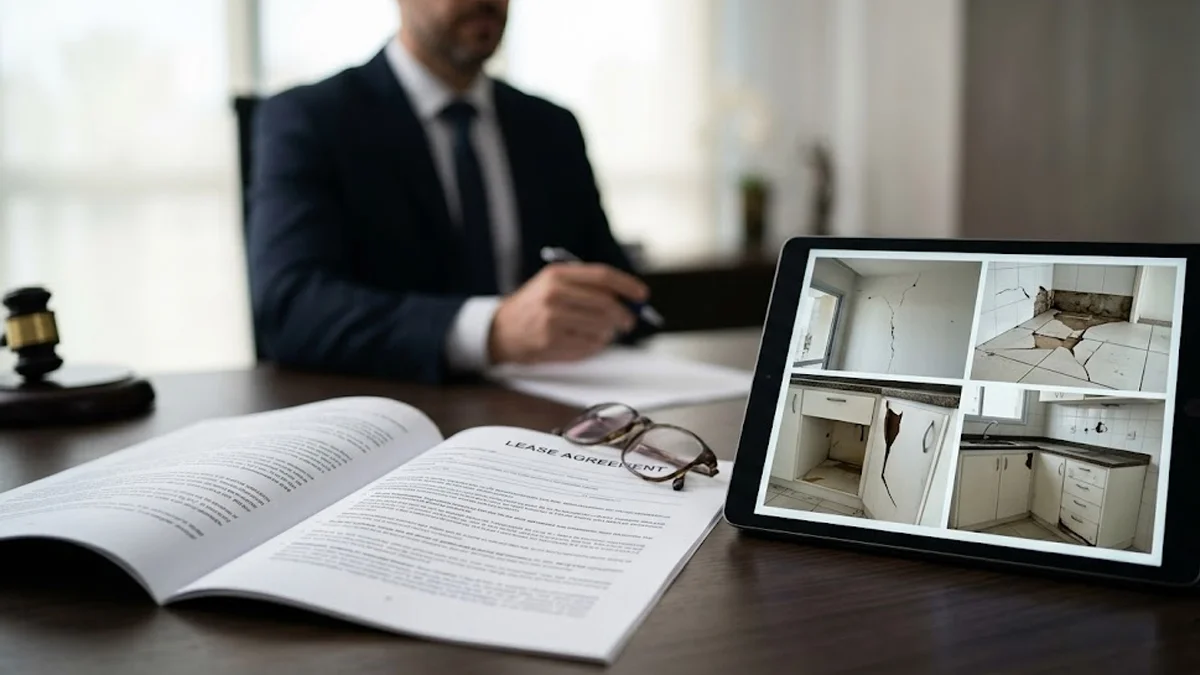Advogado em escritório examinando fotos de danos em imóvel e contrato de locação sobre a mesa.
