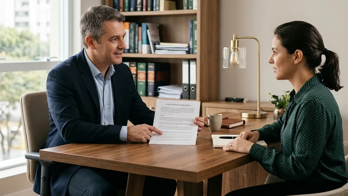 Advogado em ambiente de escritório conversando com cliente sobre direitos trabalhistas e pausa de descanso.