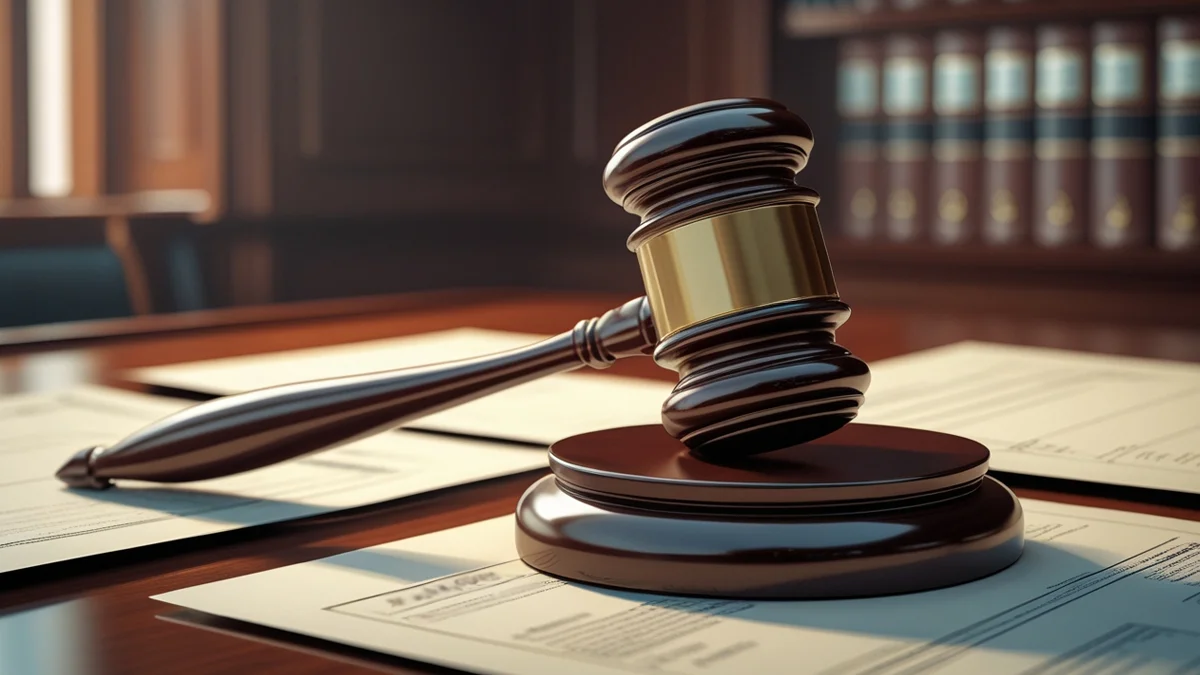 Martelo de juiz sobre documentos jurídicos simbolizando a extinção e o arquivamento de um processo judicial.