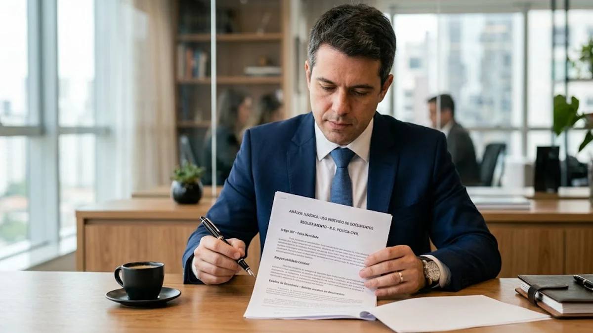 Advogado em seu escritório, segurando um documento jurídico sobre roubo de identidade, analisando como lidar com fraudes de documentos perdidos.