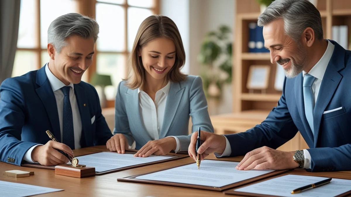 Advogado especialista em sucessões mediando uma reunião de inventário, com foco em um documento de partilha que um herdeiro se recusa a assinar.