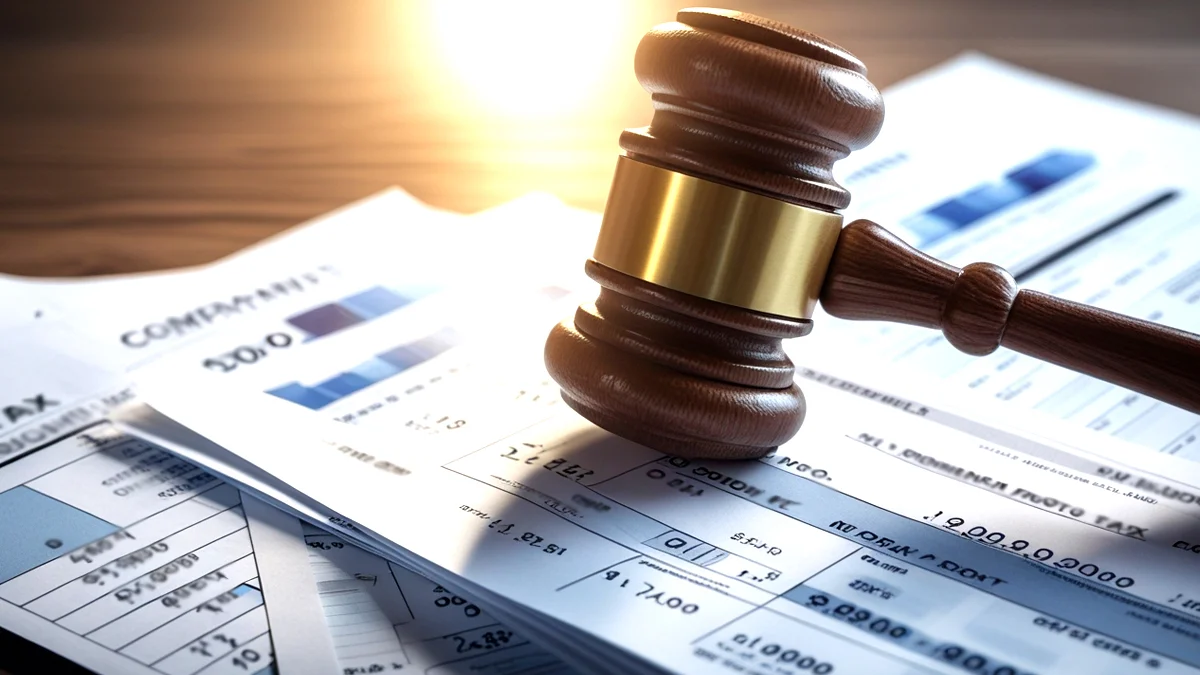Um martelo da justiça sobre documentos fiscais, simbolizando as punições legais para empresas que sonegam impostos.