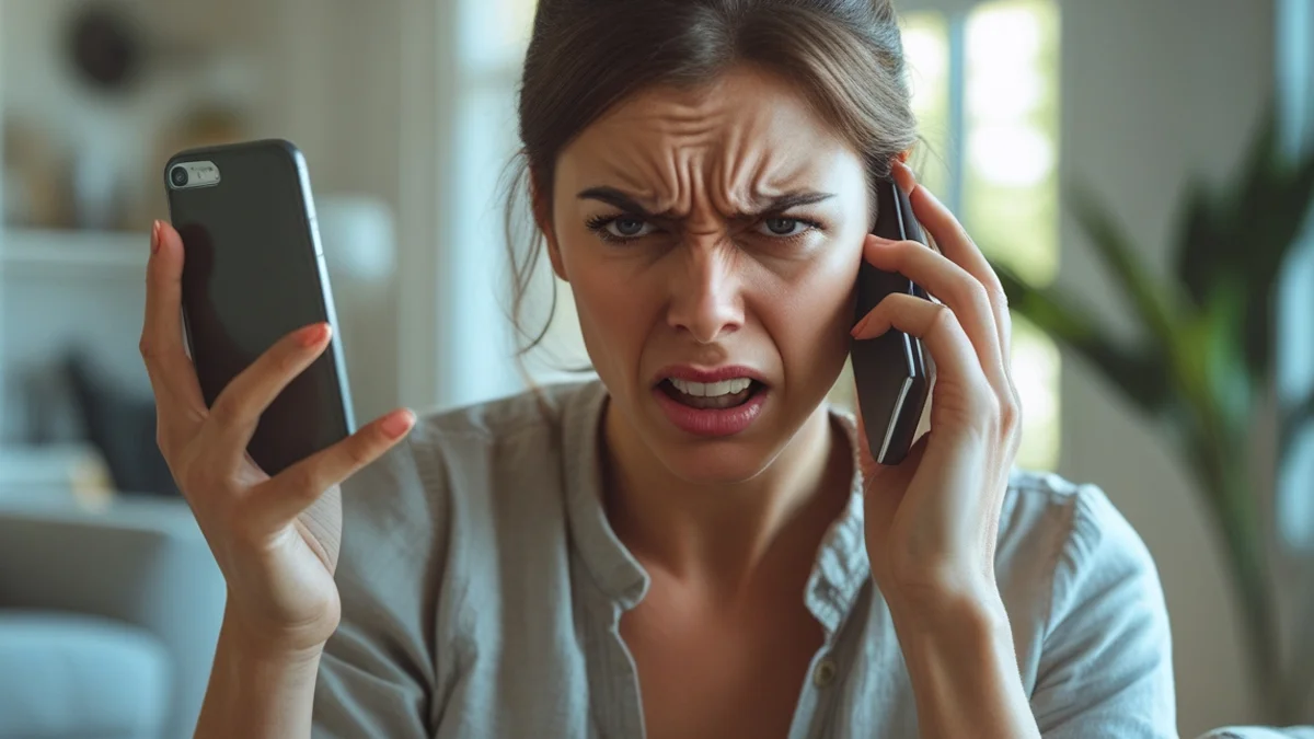Pessoa frustrada segurando celular com várias chamadas perdidas de cobrança abusiva. Contexto de direito do consumidor.