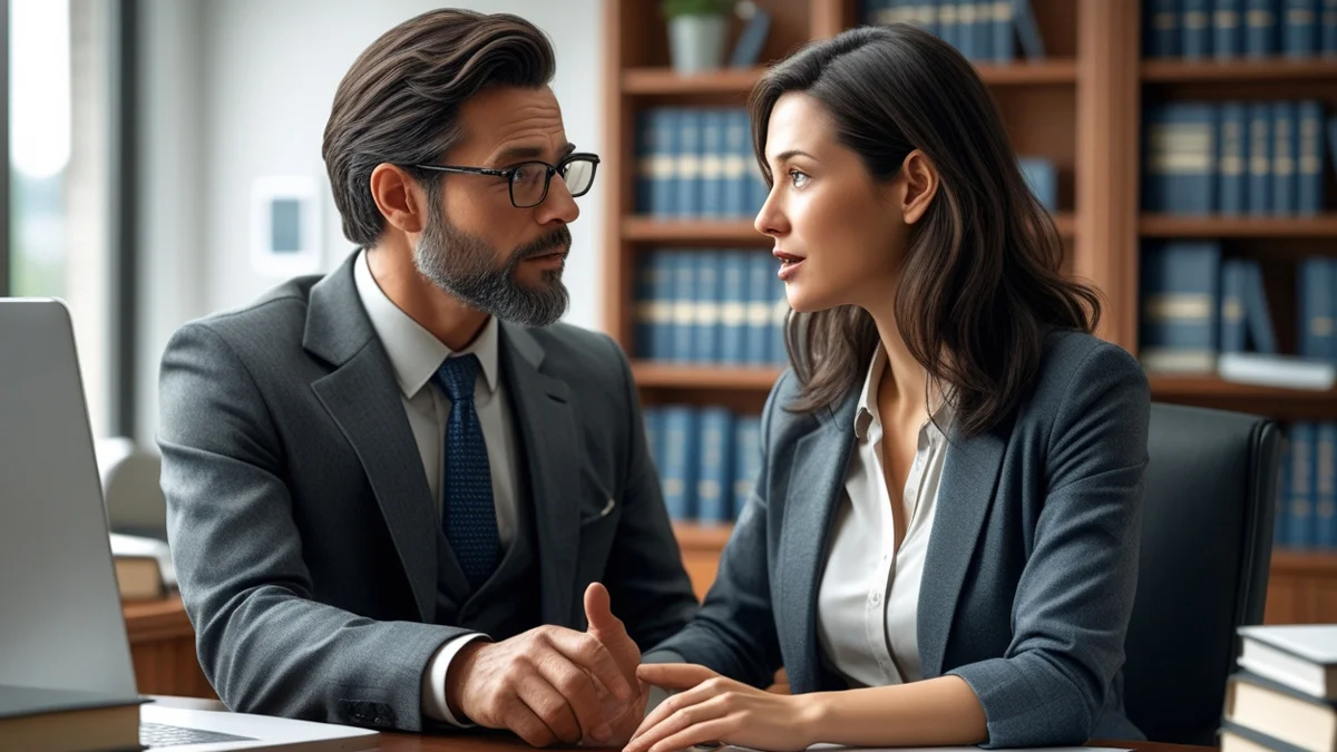 Mulher conversando com advogado especialista em direitos da mulher no divórcio em escritório, analisando documentos.