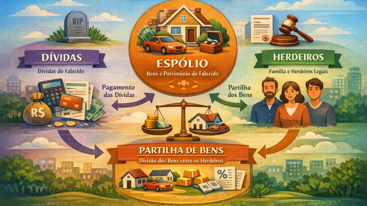 Infográfico explicando a relação entre espólio, dívidas e partilha de bens entre herdeiros em um processo de inventário.